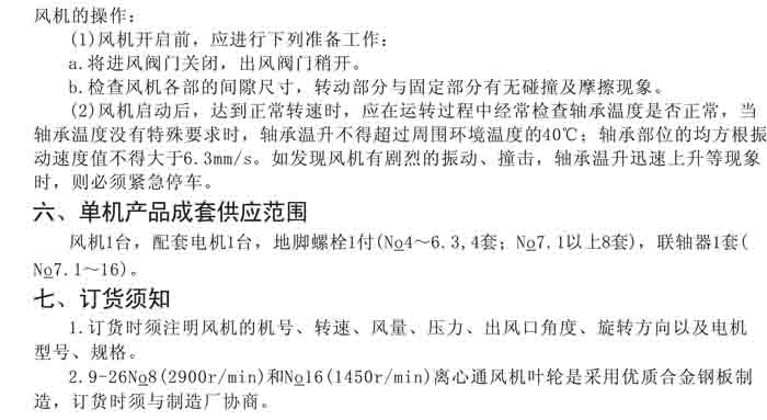 一、風機選用參考、安裝維護使用說明、常見故障分析、訂貨注意事項
